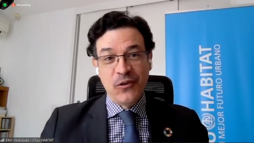 Luego, Elkin Velázquez, de ONU Hábitat, considera importante la conversación entre el terreno y las agendas globales, ya que los objetivos que pone la ONU son ideales, y hay que aterrizar para poner en práctica planes para lograrlos. Es fundamental comprometerse al gran reto que es que estos objetivos lleguen a la conversación del día y a día y que se crea que son posibles y alcanzables. Destaca, al igual que Hernández, la importancia del ODS n° 17, que trata de realizar alianzas. La perspectiva de cocreación es fundamental: todo es participativo. Hay que crear herramientas para ir hacia ese lado. Invita a la reflexión en relación a cómo integrar la accesibilidad en tiempo real a información a los planes estratégicos. Dice que debemos tener adaptabilidad.