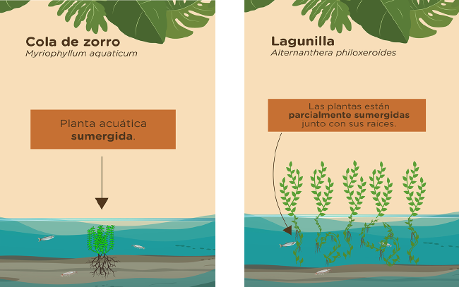 Se pueden utilizar diferente tipos de plantas acuáticas: las flotantes como el Jacinto de agua (Pontederia crassipes) , las sumergidas como la Cola de zorro acuática (Myriophyllum aquaticum) y las emergentes como el Junco (Schoenoplectus californicus).