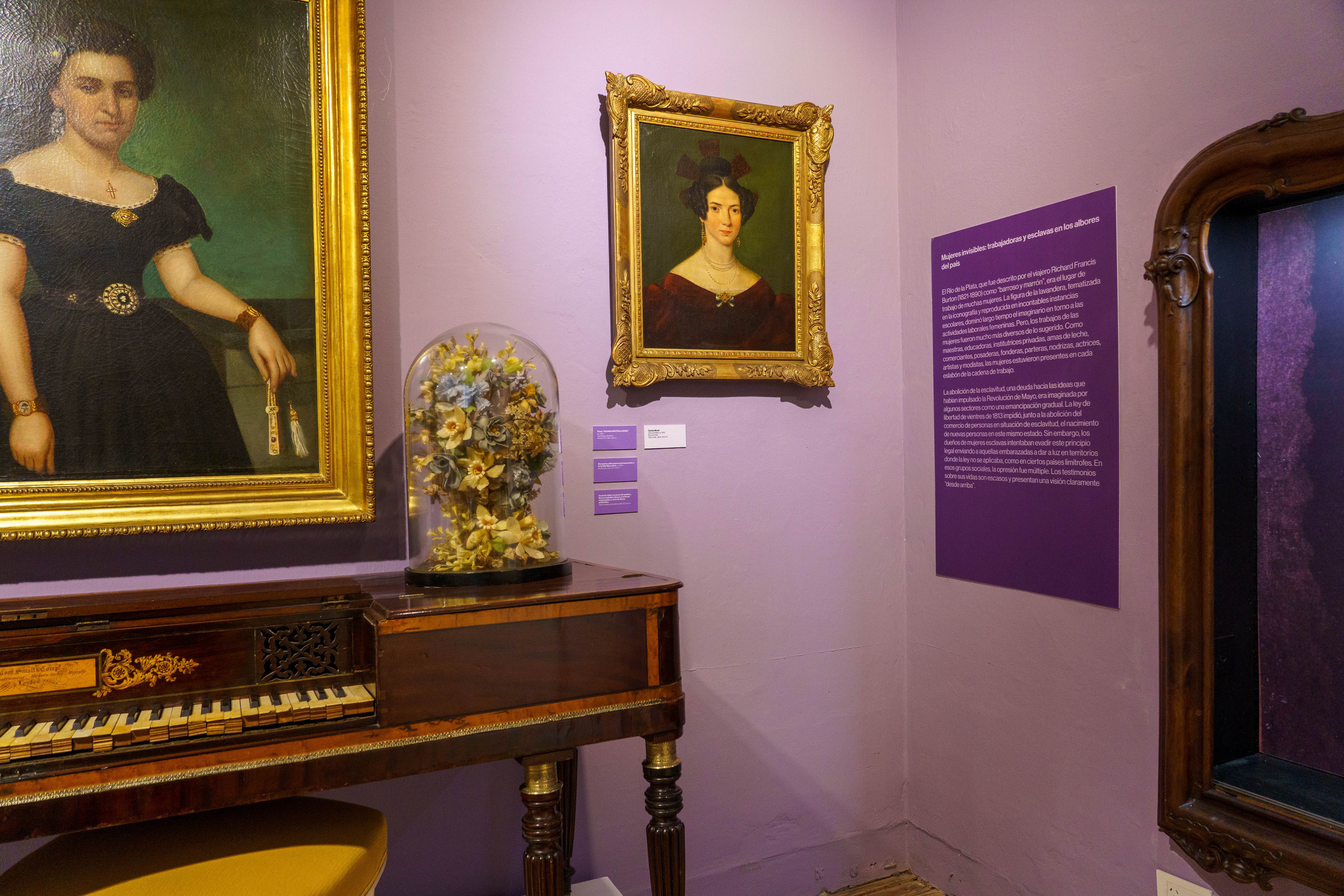 Esta sala, dedicada mediante cinco núcleos a contar algunos episodios de la historia de las mujeres en Argentina, se basa en los rastros materiales que han sido incorporados al Museo mediante los sucesivos legados que han constituido su colección. Pero, estos registros materiales son sumamente selectivos: dan cuenta apenas de ciertos aspectos de la vida de unas pocas mujeres, pertenecientes a la élite. De las “otras” mujeres, como aquella mujer en situación de esclavitud y “de excelente servicio” que se vendía en 1832 (3) , hemos perdido casi todo resto material. Solamente nos queda la obligación de recordarlas mediante las palabras e imágenes que las representaron.