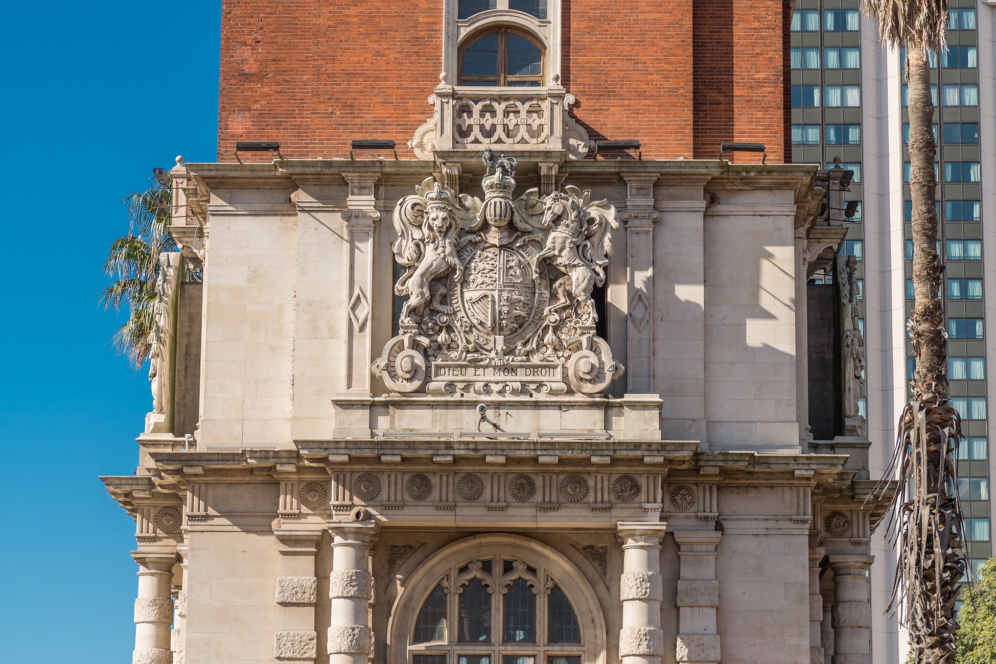 También se pueden observar los escudos del Reino Unido de Gran Bretaña y de la República Argentina. Además, se destacan los emblemas de Inglaterra y Escocia. Un unicornio y el león rampante enmarcan dos leyendas escritas en francés: “Dieu et mon droit” (“Dios y mi derecho”) y “Honni soit qui mal y pense” (“Deshonor al que piense mal de esto”), Orden de la Jarretière en Inglaterra.