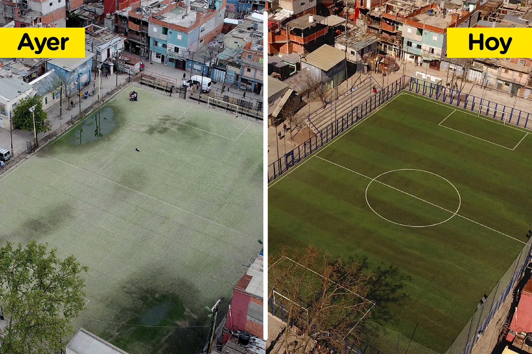 El Barrio Mugica ya tiene un nuevo estadio de fútbol al aire libre. Hoy la Cancha 5 de Güemes es el escenario principal de torneos y clases de distintas actividades deportivas, y un punto de encuentro de referencia para todos los vecinos. Renovamos su césped sintético y colocamos nuevas gradas más seguras y estables para el público espectador de los partidos.