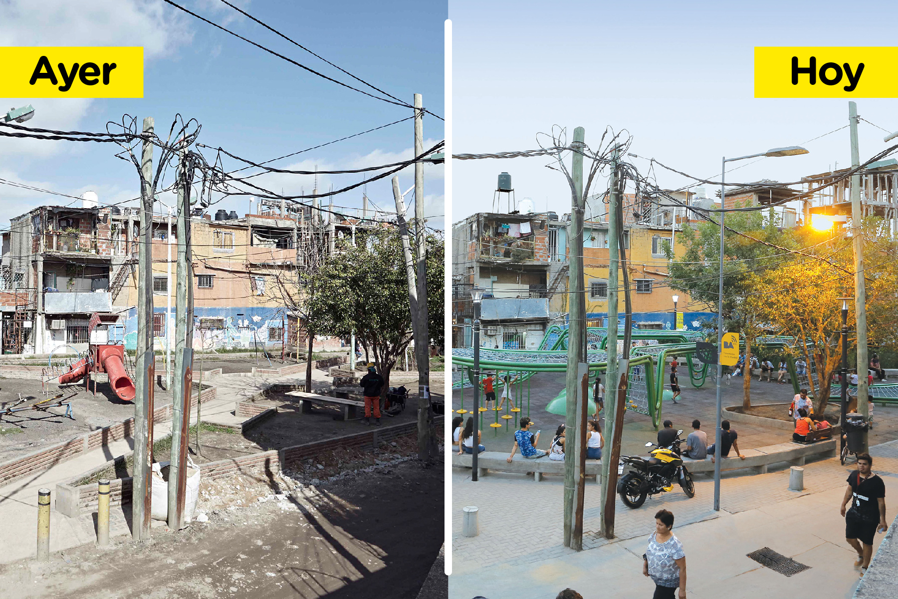 Llegada la tarde, todos los niños que vuelven de la escuela caminando por la Colectora y doblan hacia Ferroviario o Cristo Obrero, giran en la esquina y se encuentran con la nueva Plaza Triángulo que se impone con sus nuevos juegos. Se trata de una gran instalación con caminos y redes donde los niños pueden sumergirse en su imaginación y crear sus propios recorridos.