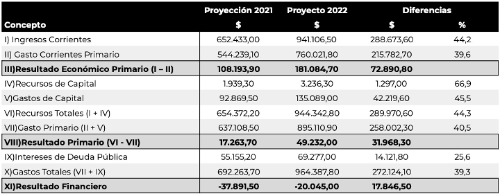 Con respecto a las proyecciones para el próximo año, se estima un total de gastos de $ 964.388 millones y un total de recursos por $ 944.343 millones, lo que proyecta un Resultado Financiero deficitario de $ 20.045 millones, que representa apenas el 2% del total del presupuesto y mejorando el resultado del 2021 que será de 5,8%.