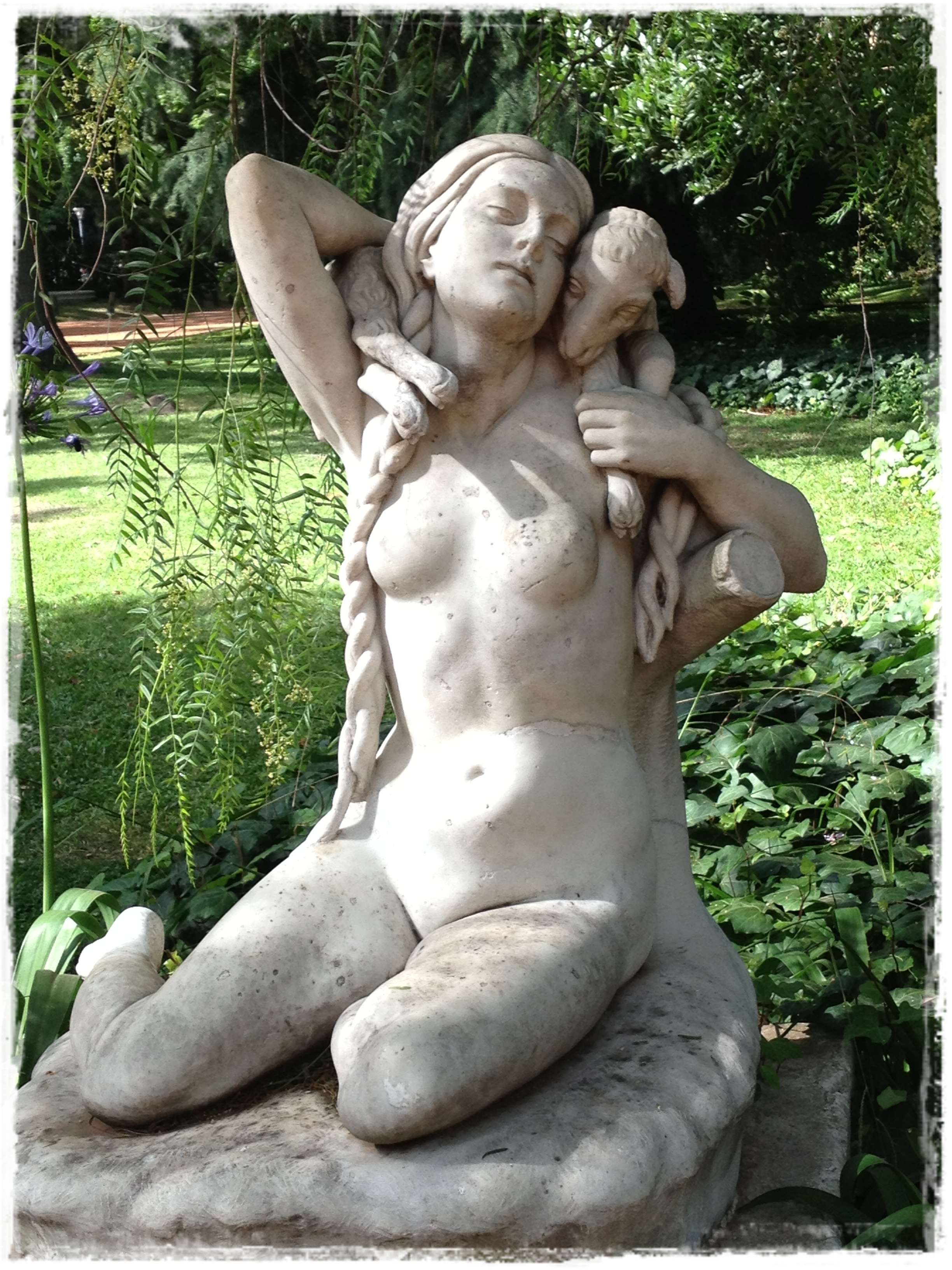 Grupo escultórico, que simboliza una escena a orillas del arroyo. Está constituido por una pastora en posición hincada que lleva sobre sus hombros un pequeño cordero. Ella está escuchando el canto que produce el arroyo en su paso por el bosque.