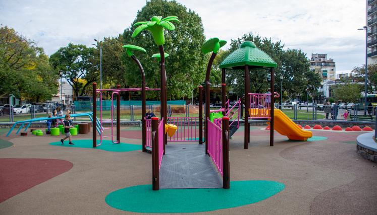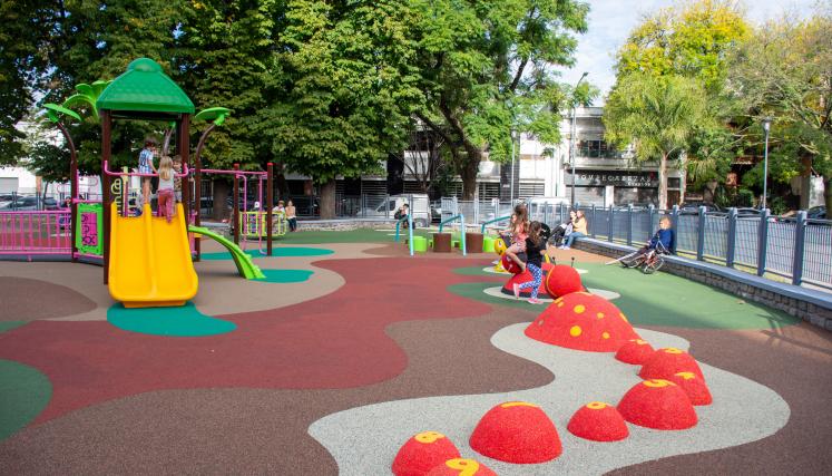 En esta plaza de Avenida Beiró al 5100 se renovó el patio de juegos con la colocación de elementos lúdicos modernos e inclusivos. Además, se mejoraron los senderos y las zonas de descanso y esparcimiento.