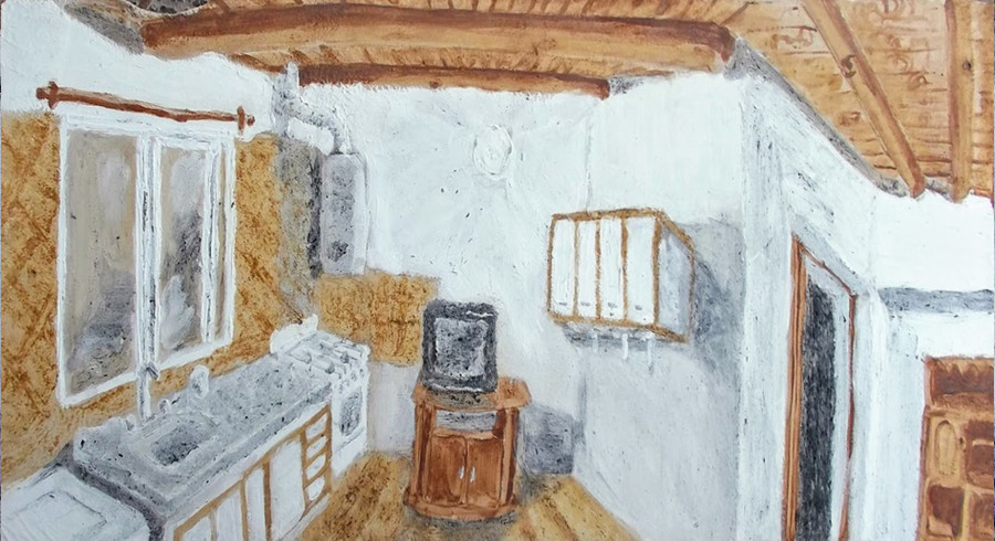 Como antesala al recorrido, las vidrieras exponen pinturas de mediano formato que fueron producidas con elementos y materiales encontrados en cada lugar representado, como pasta de dientes, detergente, limpiador cremoso, chocolate, pimentón o Polluelo (colorante para uso alimenticio), entre otros. En este sentido, las obras proponen una idea de arqueología doméstica a través de la cual el artista busca incorporar y fijar la memoria de estos sitios dentro del hogar. En el interior de la sala se observan materiales constitutivos de la casa, su estructura y su composición, tales como arena, tierra, madera, yeso o tela. Destacan tres grandes lienzos sobre bastidores que evidencian un avanzado proceso de humedad. El sistema de montaje lleva la pintura a una tridimensionalidad que le permite explorar las interrelaciones entre los cuerpos y los espacios. Las piezas aluden a los cielorrasos con manchas producto de goteras, y sus dimensiones son a escala real de la casa natal del artista; lo cual, sumado a su inclinación hacia el espectador, las vuelve amenazantes. Al finalizar, la sala audiovisual proyecta una serie de videos en los que se ve al artista realizando diversas tareas de construcción, convertido así en un objeto más dentro de la casa.