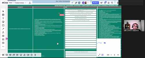 En el siguiente paso, los participantes fueron derivados a cada una de las tres salas temáticas habilitadas y elegidas oportunamente al momento de la inscripción: Sala 1) Formación: Ecosistema accesible de aprendizaje integral e innovación educativa inclusivos para el desarrollo sostenible y resiliente; Sala 2) Empleo: Trabajo digno con acceso igualitario y empleo genuino e inclusivo hacia el crecimiento de los sectores estratégicos; y Sala 3) Producción: Matriz productiva, innovadora, sustentable, climáticamente inteligente para el desarrollo metropolitano. Se utilizó como herramienta la plataforma colaborativa de trabajo online Miro. Cumplido el plazo de trabajo estipulado, las organizaciones regresaron a la sala principal para presentar los aportes y nuevas propuestas en relación a las Acciones y Proyectos.