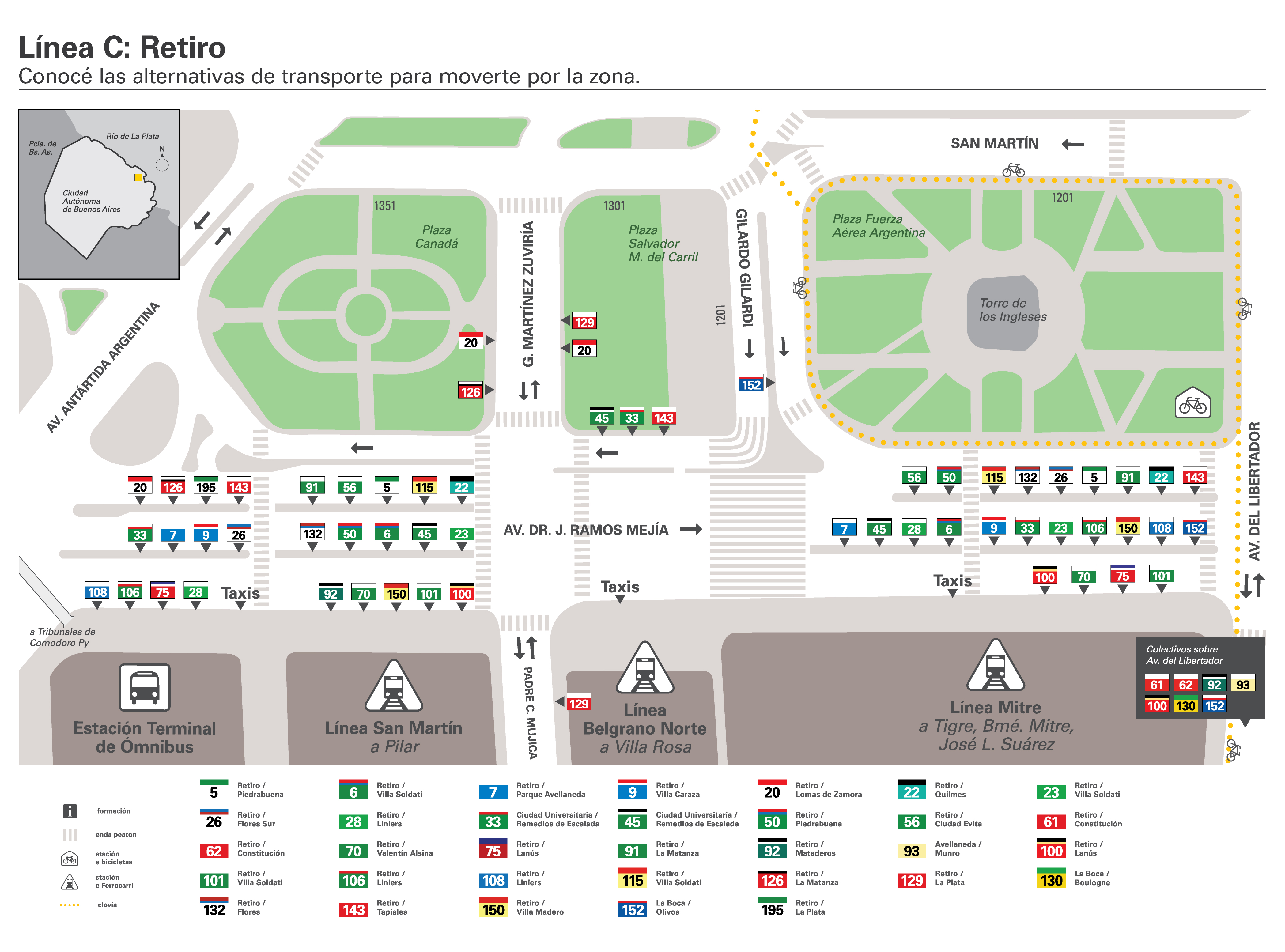 - Retiro (Plaza Fuerza Aérea): Av. del Libertador y Ramos Mejía. Comuna 1.