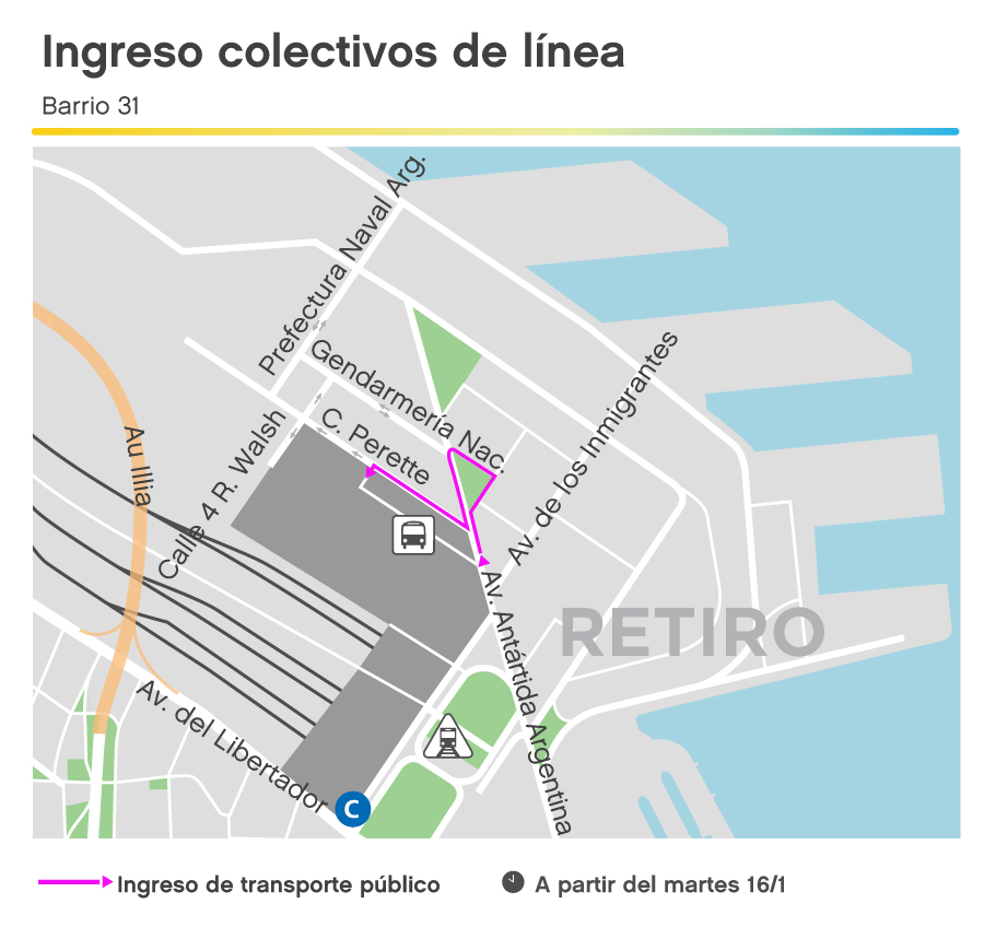 - Ingreso a la Terminal de Ómnibus de Retiro: av. Antártida Argentina; Carlos H. Perette; Rodolfo Walsh (Calle 4).