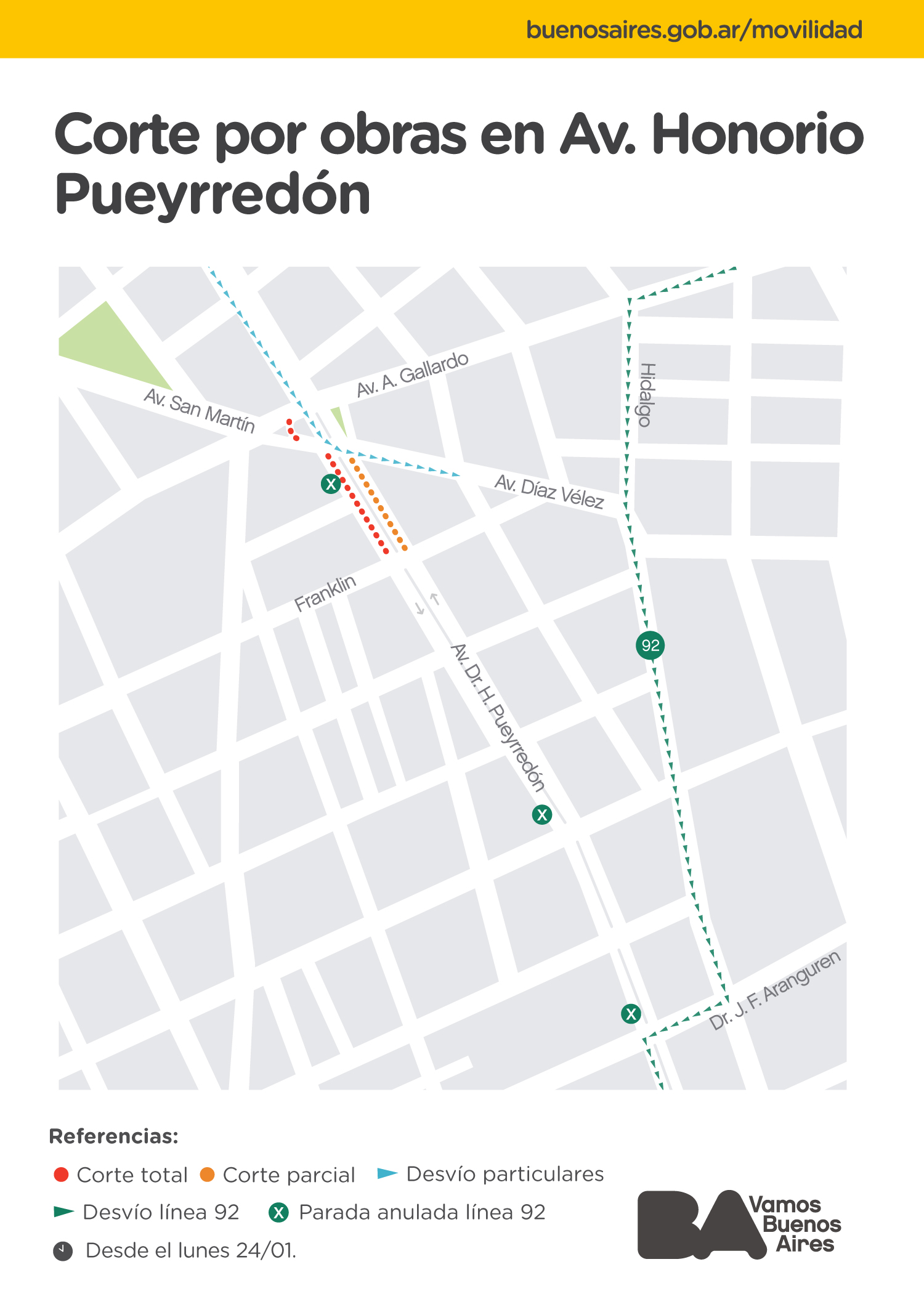 *Desvío de colectivo - línea 92*: av. Ángel Gallardo, Hidalgo, Dr. Juan Felipe Aranguren, su ruta.
