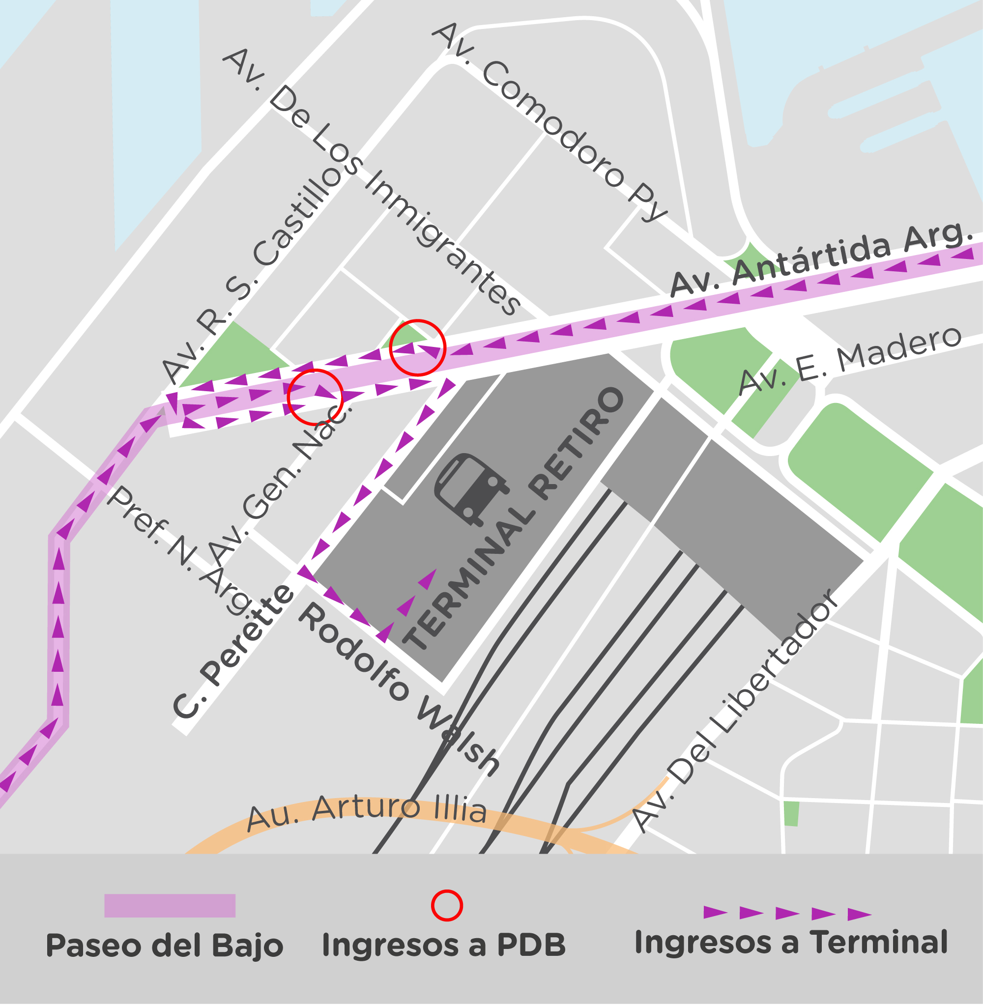 ● Aquellos Ómnibus de Larga distancia provenientes del norte que ingresan al Paseo del Bajo por la AU Illia deben tomar la salida hacia la Terminal de Ómnibus de Retiro, la cual se encuentra a la altura de la Av. Gendarmería Nacional y circular por la Av. Antártida Argentina hasta la calle Perette donde tienen el ingreso a la terminal.