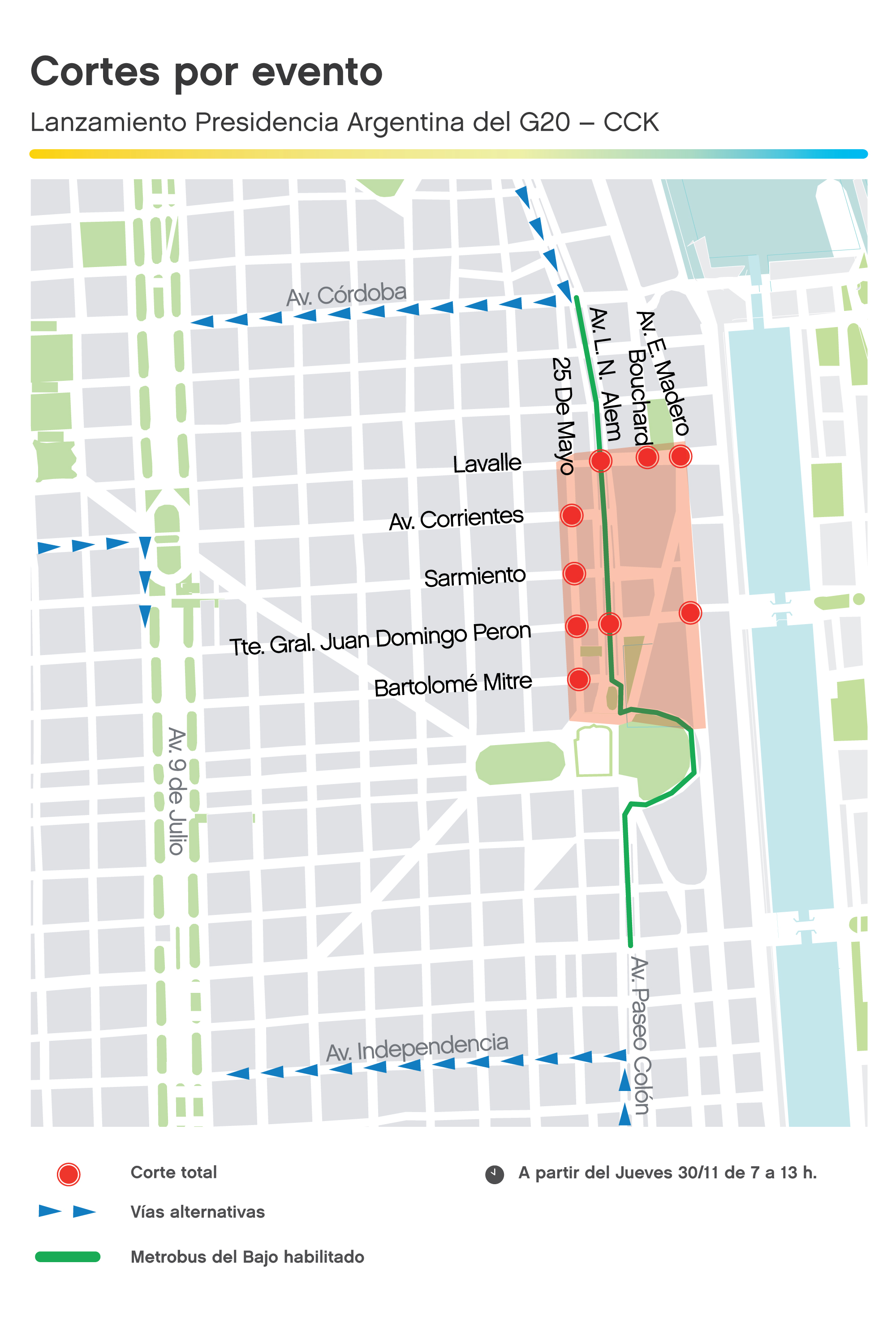Metrobus del Bajo: Habilitado (no se podrá ascender ni descender en los paradores ubicados entre av. Corrientes y Juan D. Perón).