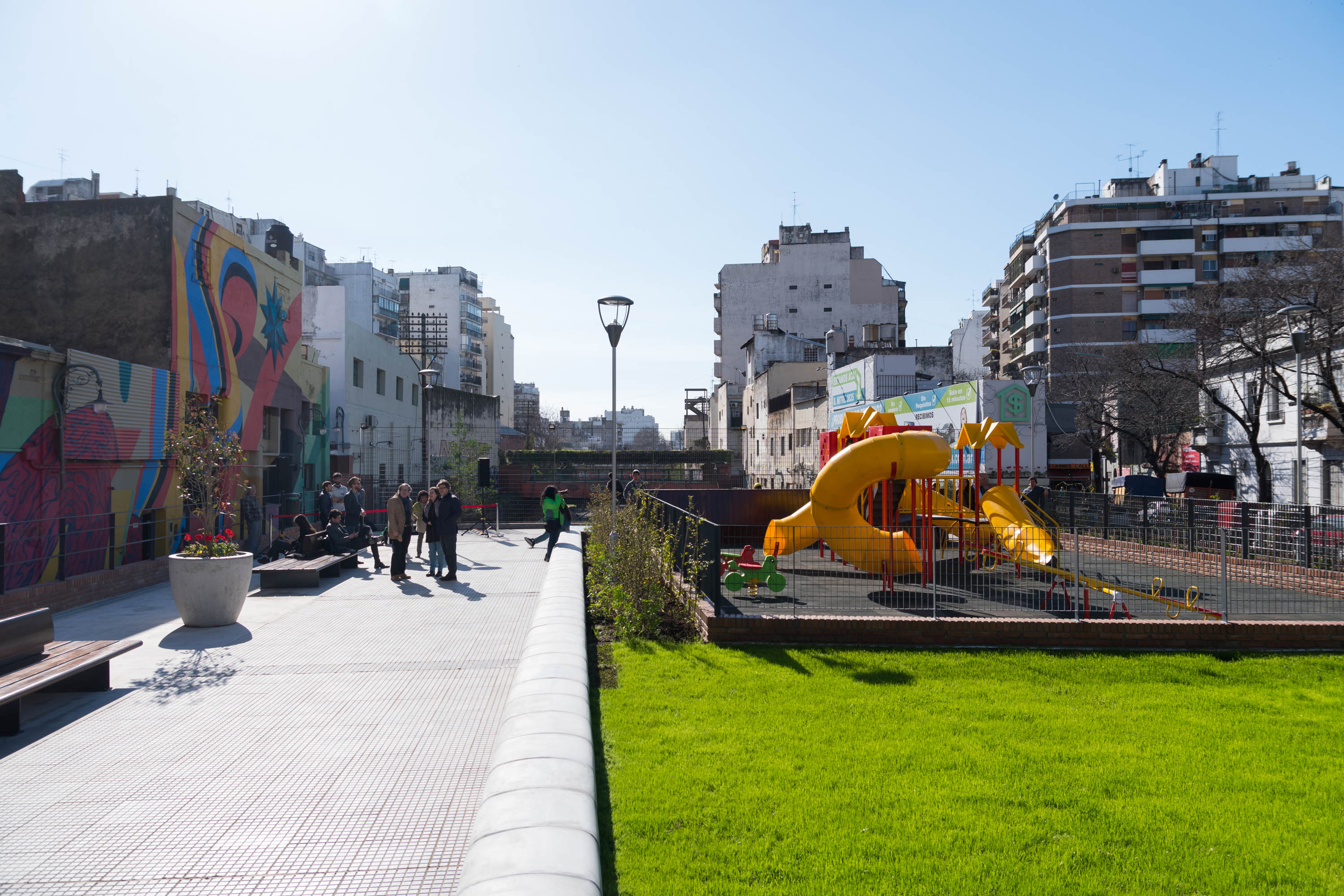 En el marco del Plan Verde, la obra contempló la construcción de una cubierta sobre las vías del tren que incluye mobiliario urbano, nuevos bancos de hormigón, cestos de basura y bebederos, un patio de juegos inclusivos e iluminación con tecnología LED.