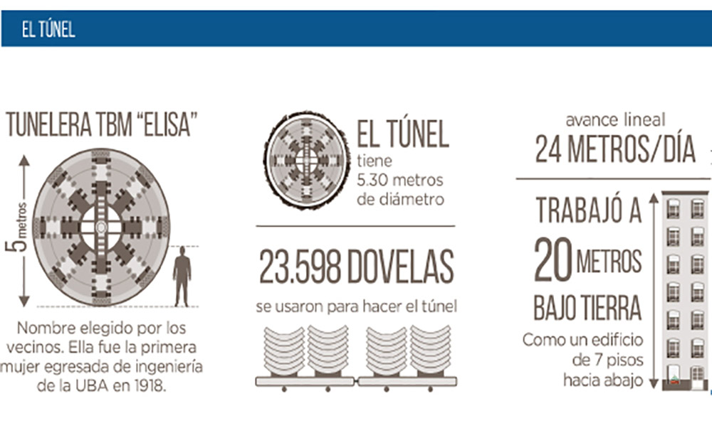 El primer tramo corresponde a 5,9 kilómetros realizados por la tuneladora “Elisa”, que comenzó su excavación en la costanera Norte por debajo de la calle La Pampa, hasta la intersección con la Av. Victorica.