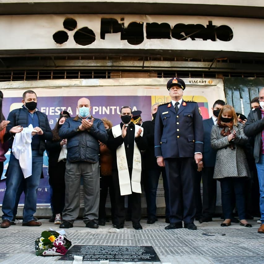 Luego, los presentes se desplazaron hasta la puerta del ex local Pigmento, donde también se dispuso una placa conmemorativa con la leyenda Un verdadero héroe no es quien tiene poderes, es quien no tiene miedo de dar su vida por los demás.