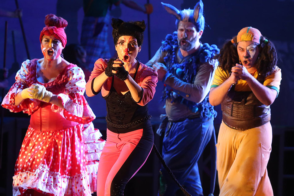 Con la dirección de Pablo Gorlero, libro y letras de Sergio Bardotti y música de Luis Bacalov, es una obra que habla de la unión, del respeto por el otro, la solidaridad y la buena convivencia en comunidad. Cuenta las aventuras de cuatro animales que fueron explotados por sus amos y deciden huir hacia la ciudad para probar suerte como banda musical. El Burro, que representa a los intelectuales, harto de cargar leña sin recibir ni la mínima atención, escapa de su patrón. En el camino se encontrará con El Perro, quien perdió el olfato y siente que no sirve para guardián ya que nació sólo para trabajar como “amigo”. Por eso se escapó de su amo, pero no aprende a valerse por sí mismo sin acatar órdenes. Ambos se topan con La Gallina, representante de los trabajadores, quien huyó de la granja en la que vivía cuando no pudo poner más huevos y escuchó que se serviría para el puchero. Por último, se une a ellos La Gata, símbolo de los artistas, que vivía encerrada en un departamento, sola todo el día. Los cuatro sueñan con una ciudad ideal, pero no saben exactamente con qué se encontrarán. La meta podría ser armar un grupo musical, pero tal vez sólo alcance con formar una sociedad donde todos sean una pieza fundamental. Aunque ellos saben que deberán tener cuidado porque los amos siempre vuelven.