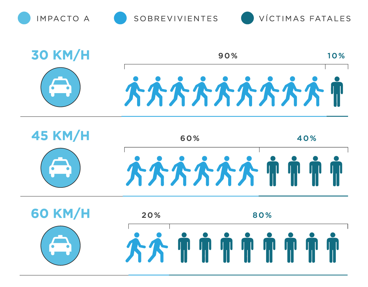 La importancia de respetar las velocidad máximas radica en que en un impacto a 30km/h sobreviven 9 de cada 10 peatones, en uno a 45km/h sobreviven 5 y en uno a 60km/h sobrevive solo 1.
