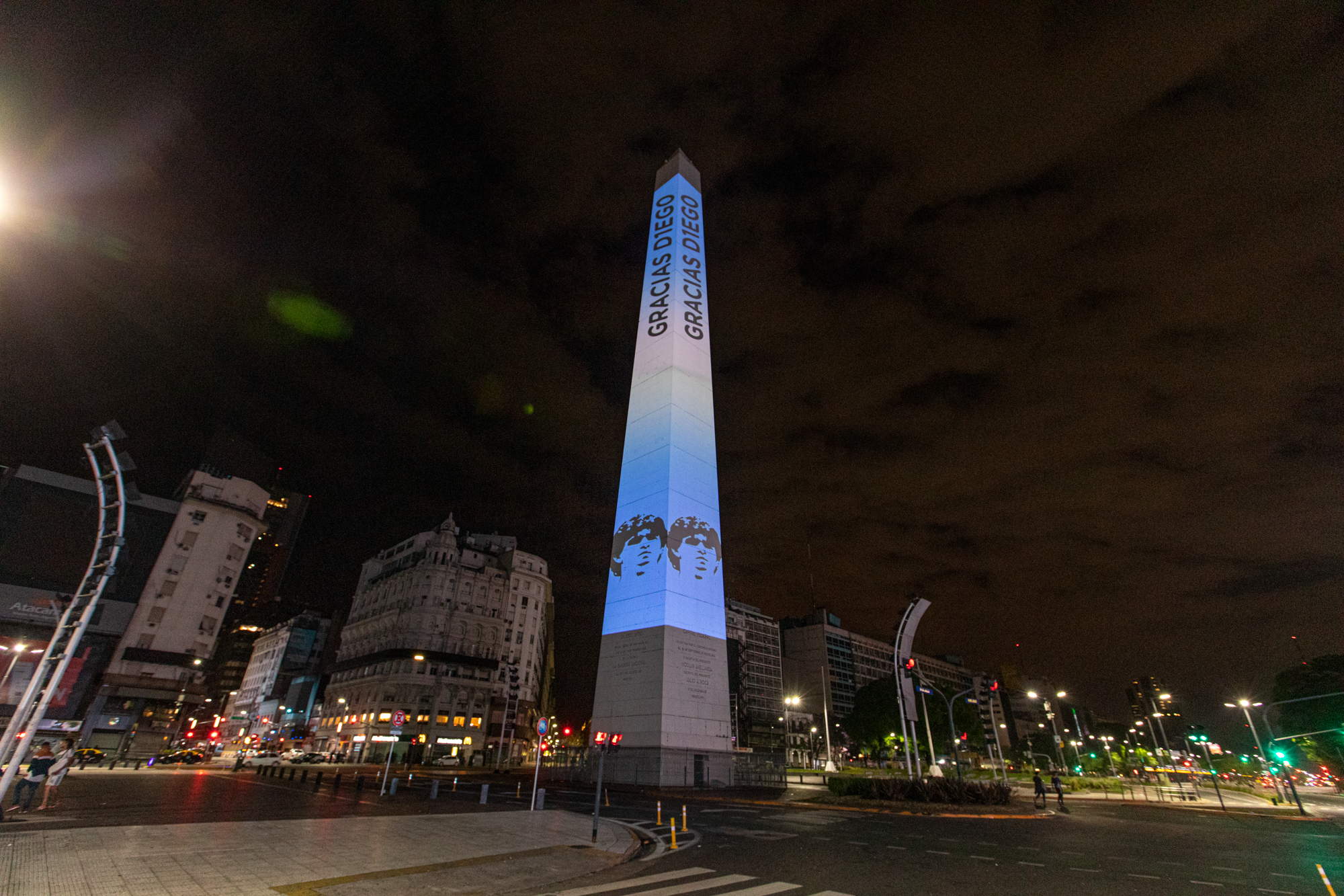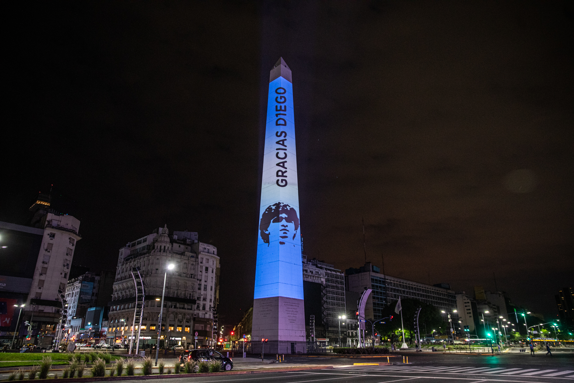 El jueves y viernes, desde las 20 h, el Ministerio de Espacio Público e Higiene Urbana porteño realiza una proyección en el Obelisco para homenajear a Maradona en su fallecimiento. Una forma más de despedir al ídolo.