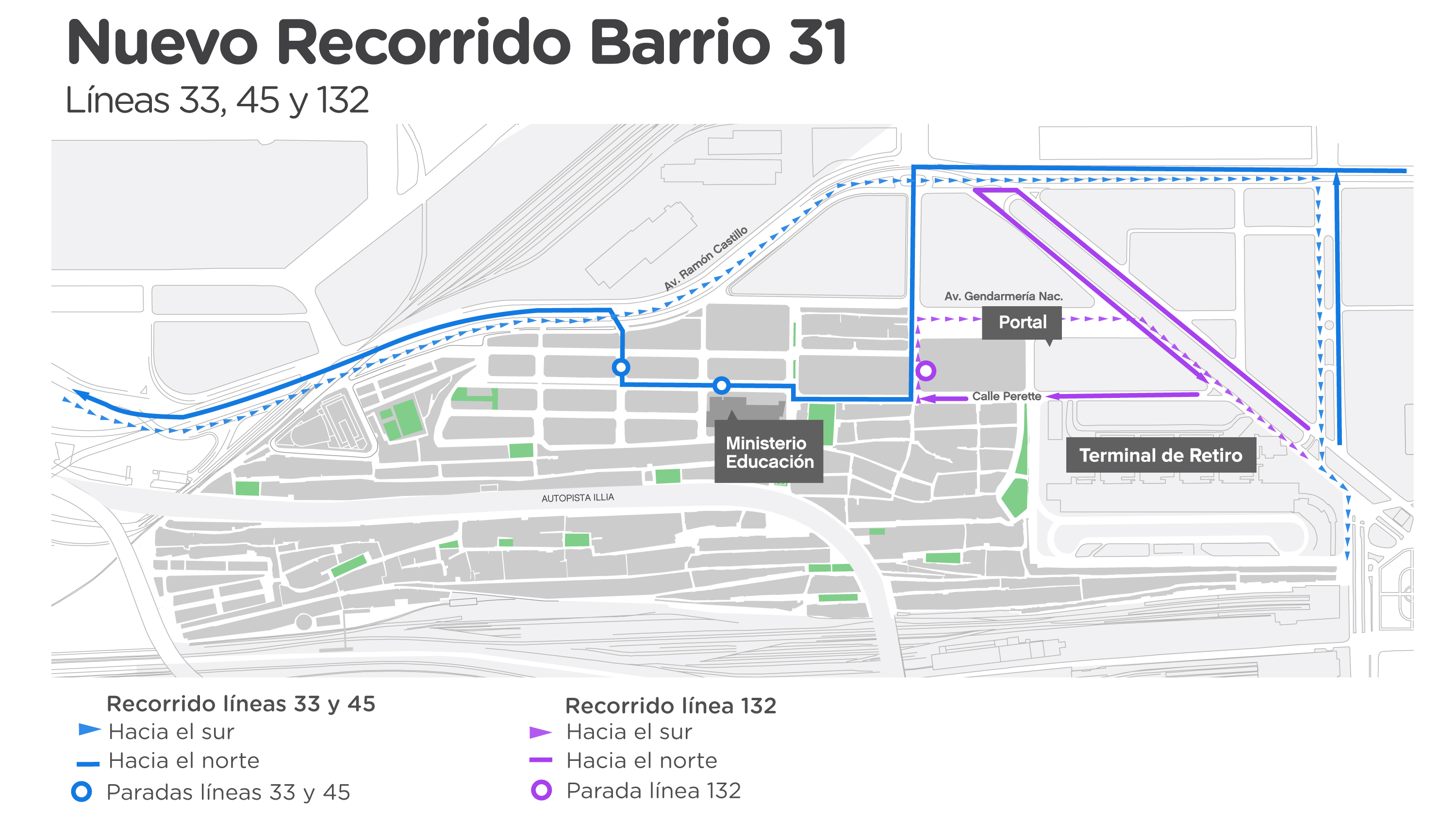 En su trayecto previo, la línea 132 no ingresaba al Barrio 31, sino que continuaba por Carlos Perette hacia el predio de Retiro. A partir de este lunes extiende su recorrido y la unidad entra por Carlos Perette, dobla en Prefectura Naval Argentina, toma Gendarmería y sigue su recorrido. Durante los primeros días un equipo de Agentes de Tránsito acompañará la implementación de los nuevos recorridos.