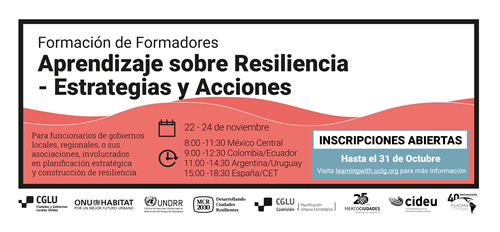 Los días 22, 23 y 24 de noviembre se llevó a cabo el Taller de Formación de Formadores “Aprendizaje sobre Resiliencia: Estrategias y Acciones”, desarrollado y organizado por la Comisión de Planificación Estratégica Urbana de CGLU, que copreside la Ciudad de Buenos Aires junto con la Ciudad de Durban, y que contó con la participación de representantes de ciudades de Argentina, Chile, Brasil, Bolivia, Costa Rica, Cuba, Ecuador, México, España, El Salvador, y organizaciones de la sociedad civil de la Región.