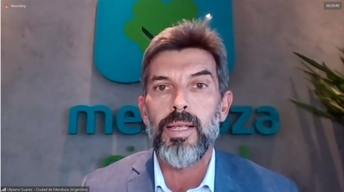 Ulpiano Suárez, Intendente de Mendoza, describió el modelo para su ciudad plantea un basado en tres ejes: desarrollo económico, inclusión social y cuidado del ambiente. Anuncia la creación del Comité Municipal del Cambio Climático, la realización de la Alianza de Ciudades por el Clima y la perspectiva de la Ciudad de 15 minutos para la cual están trabajando para lograrlo. Natalia Chueca Muñoz, Teniente Alcalde de Servicios Públicos y Movilidad del Ayuntamiento de Zaragoza, en representación de Jorge Azcón, Alcalde de Zaragoza y Presidente de CIDEU, destaca el compromiso en esta época post Covid con la sostenibilidad y recuperación ecológica mediante la reducción de la emisión de CO2. y el ahorro .