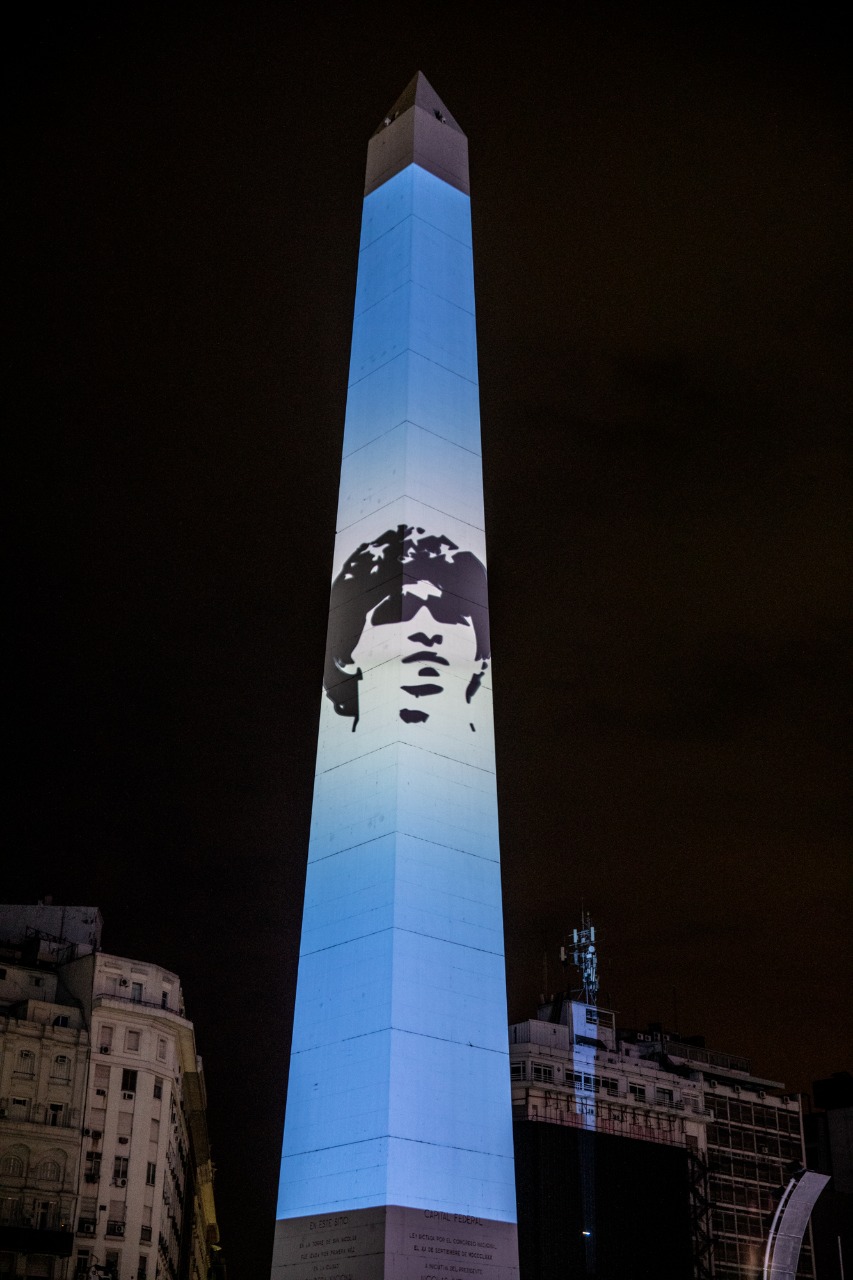 El Gobierno de la Ciudad iluminó monumentos y fachadas de edificios porteños con los colores de la bandera argentina, en homenaje al ex futbolista Diego Armando Maradona, quien falleció este 25 de noviembre a los 60 años.