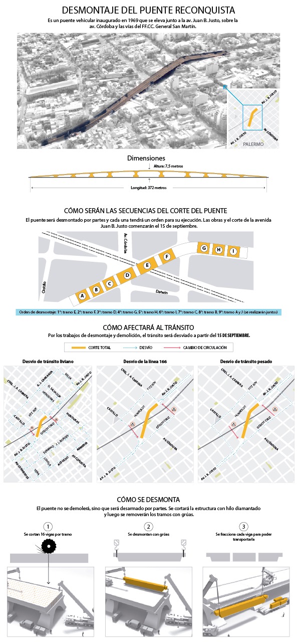 El Puente de la Reconquista es una plataforma vehicular que se eleva sobre la av. Juan B. Justo a la altura de av. Córdoba y las vías del FF.CC. San Martín. Para continuar con la obra del viaducto es necesario desmontarlo, ya que el proyecto prevé que el flujo de vehículos circule a nivel. Desde el martes 2 de octubre la av. Juan B. Justo entre Castillo y Cabrera se encuentra cortada totalmente y a partir del jueves 13 de diciembre se sumará la afectación total de av. Cnel. Niceto Vega entre Humboldt y Godoy Cruz durante aproximadamente dos meses.