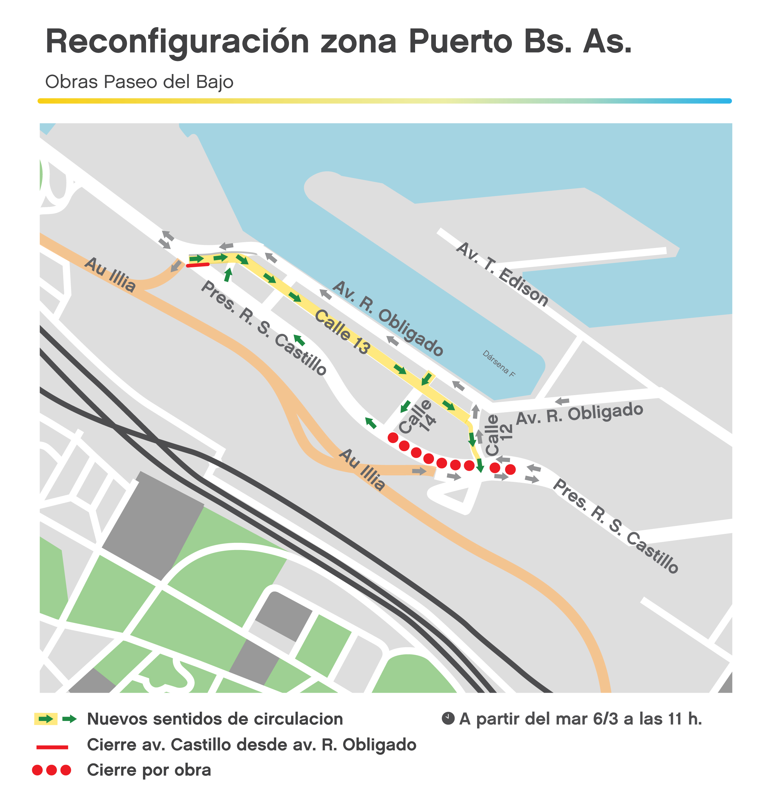 Por su parte, av. Pte. Ramón S. Castillo entre av. Costanera Rafael Obligado y Calle 14 cambiará su sentido de circulación hacia el norte.
