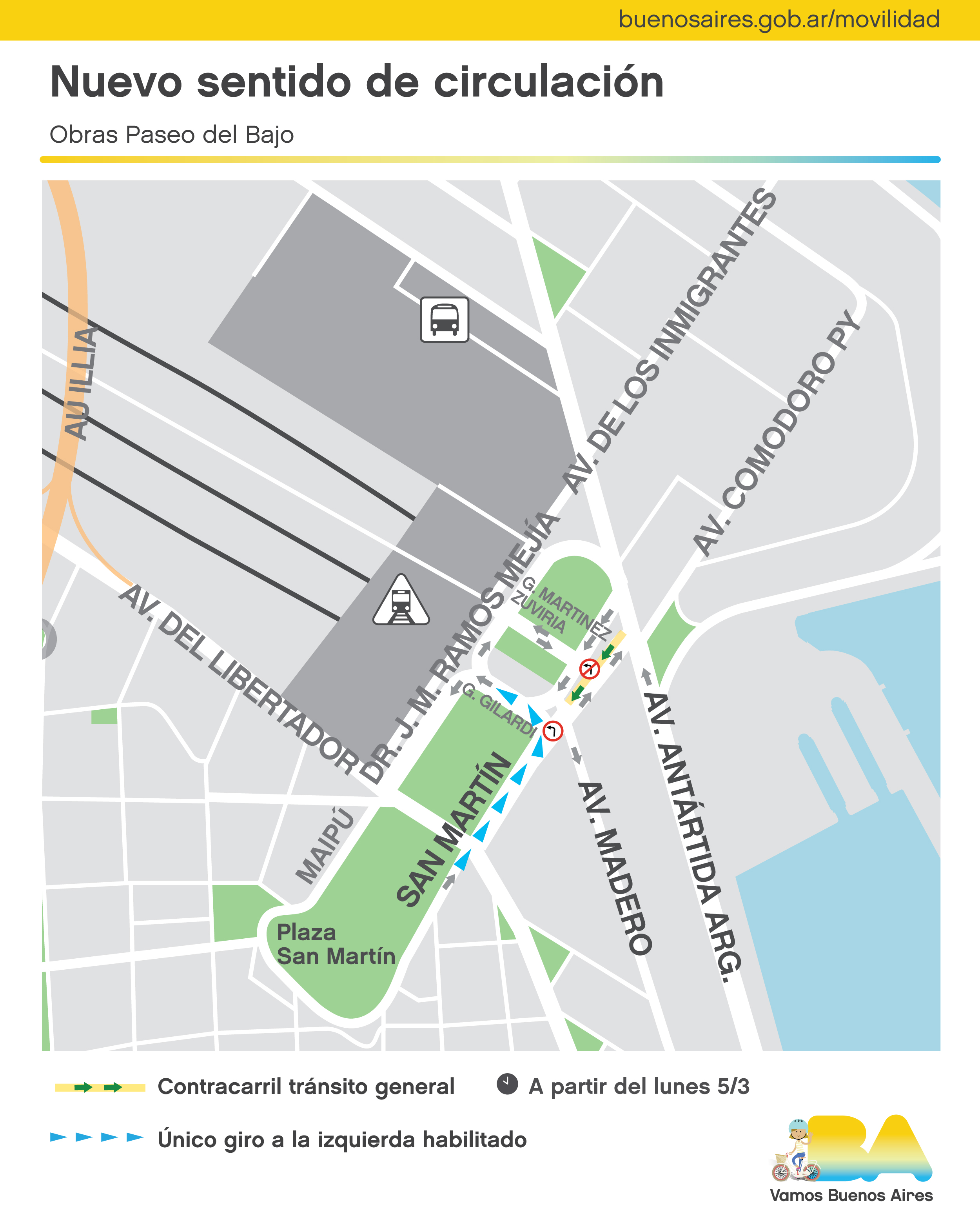 En San Martín entre av. Antártida Argentina y av. Eduardo Madero (dirección hacia el Puerto) se habilitará un contracarril (dos carriles) en dirección a av. Eduardo Madero para todos los vehículos que circulen por av. Comodoro Py al sur. Aquellos que lleguen desde el norte por av. Antártida Argentina deberán tomar los carriles habituales hacia el sur (no el contracarril).Eliminación giro a la izquierda hacia Gustavo Martínez Zuviría