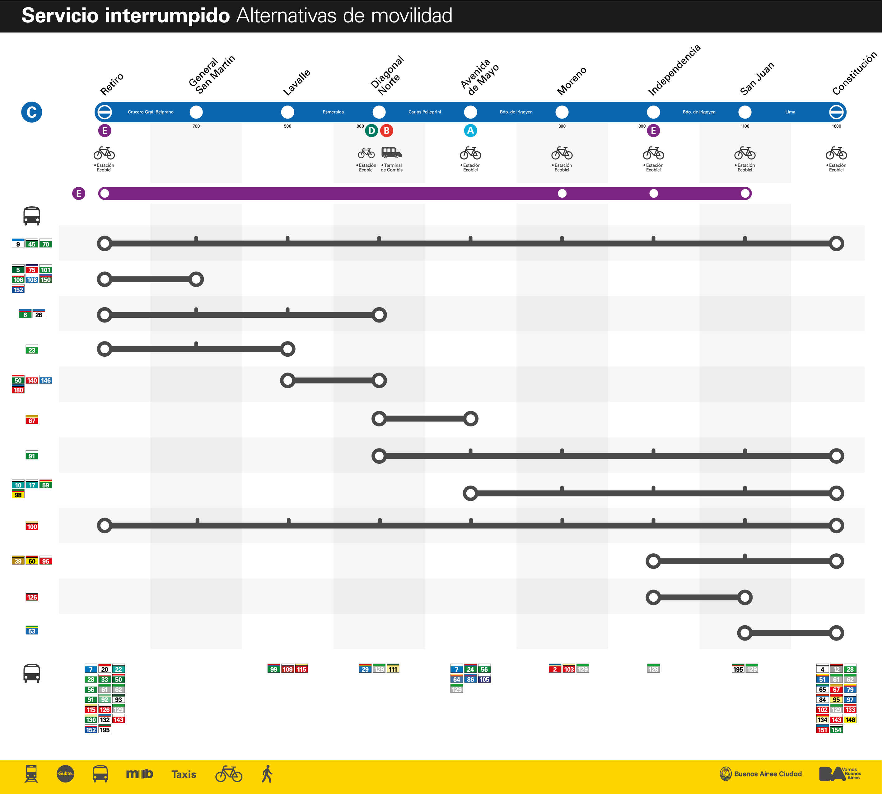 Durante la obra, los usuarios podrán optar por utilizar la Línea de subte E en Retiro, el Metrobus de 9 de Julio y el Metrobus del Bajo. Con el objetivo de generar más alternativas de movilidad para los usuarios de la línea C, se aumentará la frecuencia de los colectivos que circulan por Metrobus del Bajo y Metrobus 9 de Julio, y se realizarán rondines entre Retiro y Constitución (colectivos vacíos que buscan pasajeros y vuelven a salir vacíos a destino).