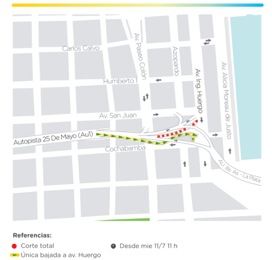 En el marco de las obras de Paseo del Bajo, desde el miércoles 11 de julio se cerró en forma definitiva la salida a av. Ingeniero Huergo destinada al tránsito liviano, ubicada del lado izquierdo de la calzada de Autopista 25 de Mayo sentido La Plata.