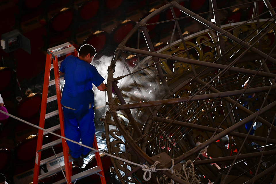 Como cada año, este lunes se llevó a cabo la limpieza y el mantenimiento de la Araña del Teatro Colón, la enorme y bellísima luminaria de la Sala Principal.