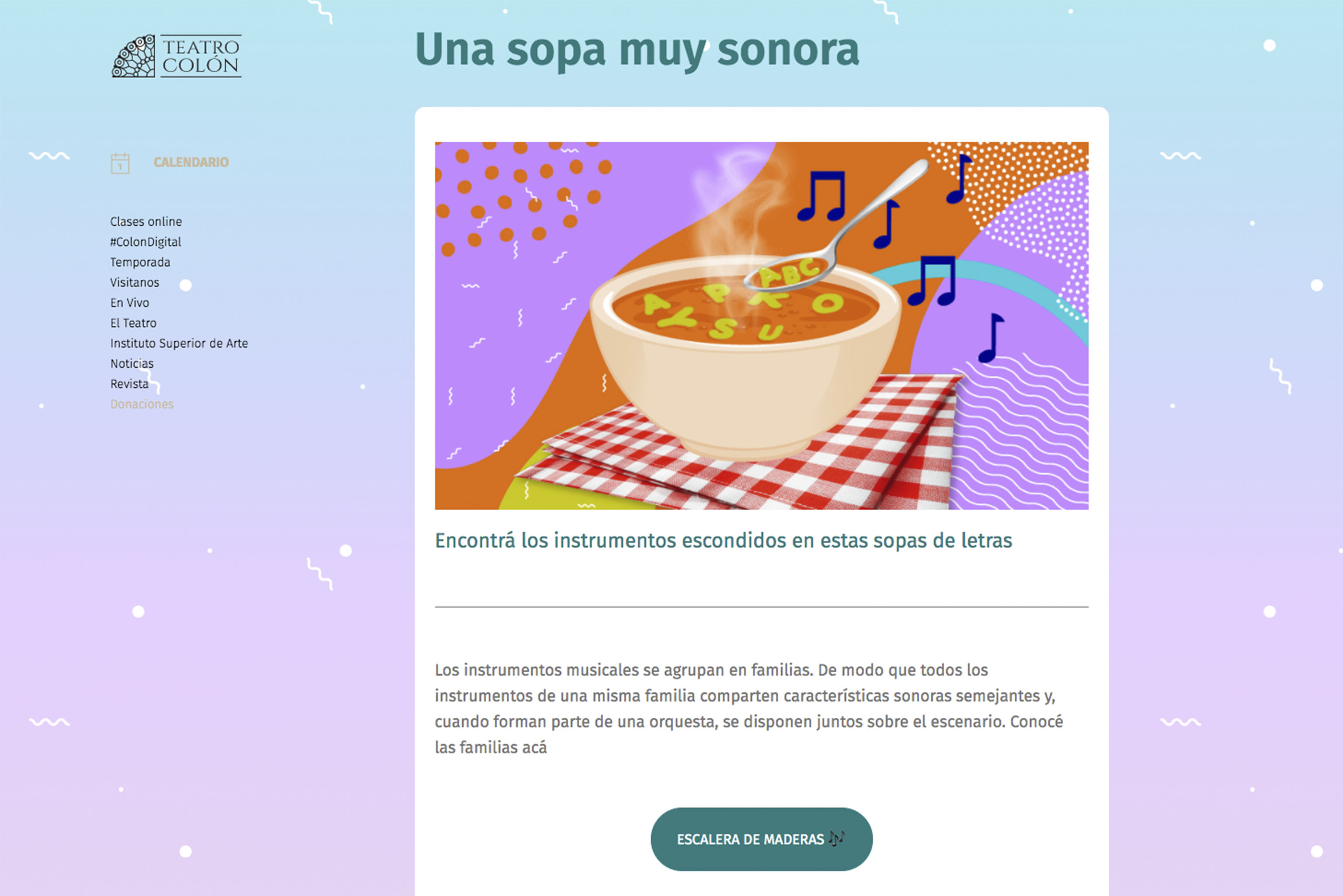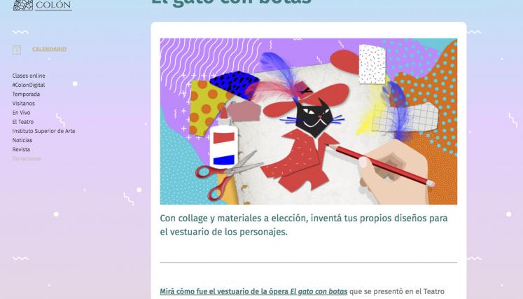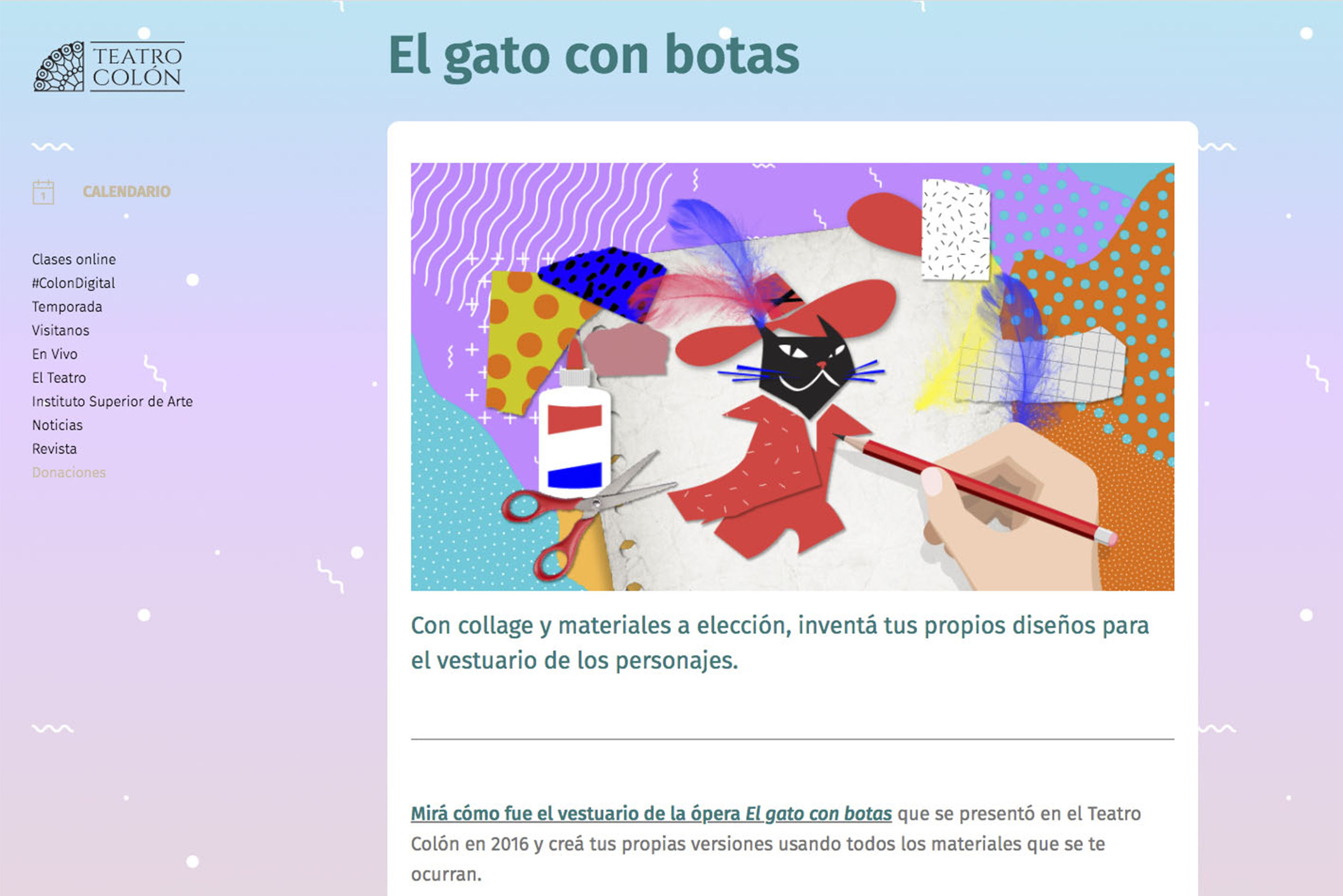 A través de la creatividad, los juegos y la diversión, las nuevas propuestas se suman a las más de 40 actividades lúdicas que forman parte de la sección #Colónparachicos y a las funciones de ópera y ballet para toda la familia que están disponibles en la página oficial del Teatro Colón como ser las óperas El Gato con Botas y La cenicienta, los ballets Baile de graduados y La bella durmiente, entre otras.
