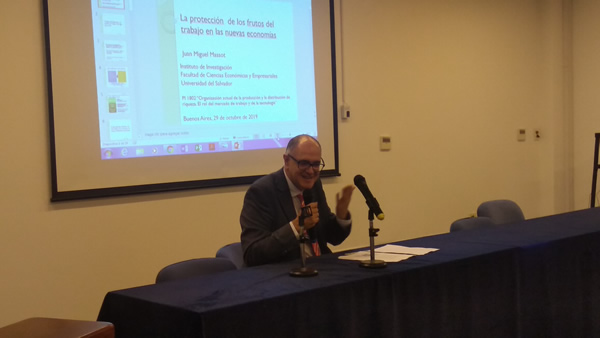 El primer expositor fue el Dr. Juan Miguel Massot, Director del Instituto de Investigación de la Facultad de Ciencias Económicas y Empresariales de la USAL, quien se refirió a “La protección de los frutos del trabajo en las nuevas economías”. Para Massot, “la apertura al exterior de las nuevas economías tiene efectos importantes, sobre las relaciones entre el trabajo especializado y no calificado. Dicha apertura aumenta la brecha salarial entre el trabajo calificado y el que no lo es, de manera que el trabajo en la nueva economía debe observarse en distintos ámbitos, sin que pueda tener características generalizables. La fuerza de trabajo está inserta en ámbitos muy diferentes los unos de los otros”.