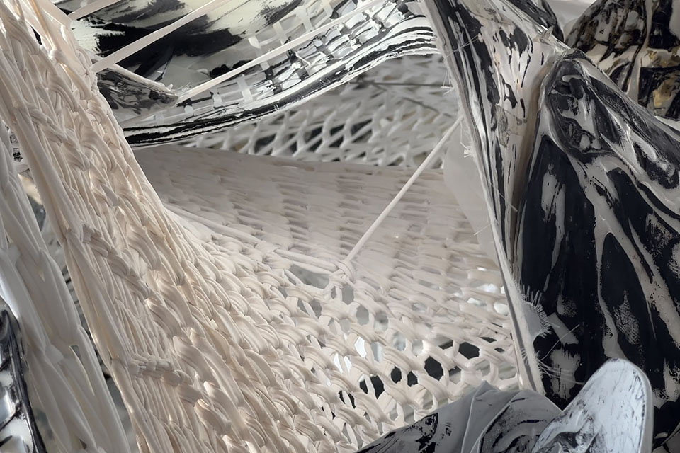 Una gran membrana elaborada a partir de residuos urbanos tales como plásticos, textiles, palos y hierros se funden en las manos de estos artistas expertos en la materia para transformarla y crear una piel monumental, una feroz acumulación que nos invita a pensar en el devenir del ser. Un planeta, un territorio, una caverna, una carpa. De estas montañas alteradas emerge una potencial belleza. Una búsqueda contradictoria que se disputa entre el rechazo y el deseo por hacer de la transformación un espacio de refugio.